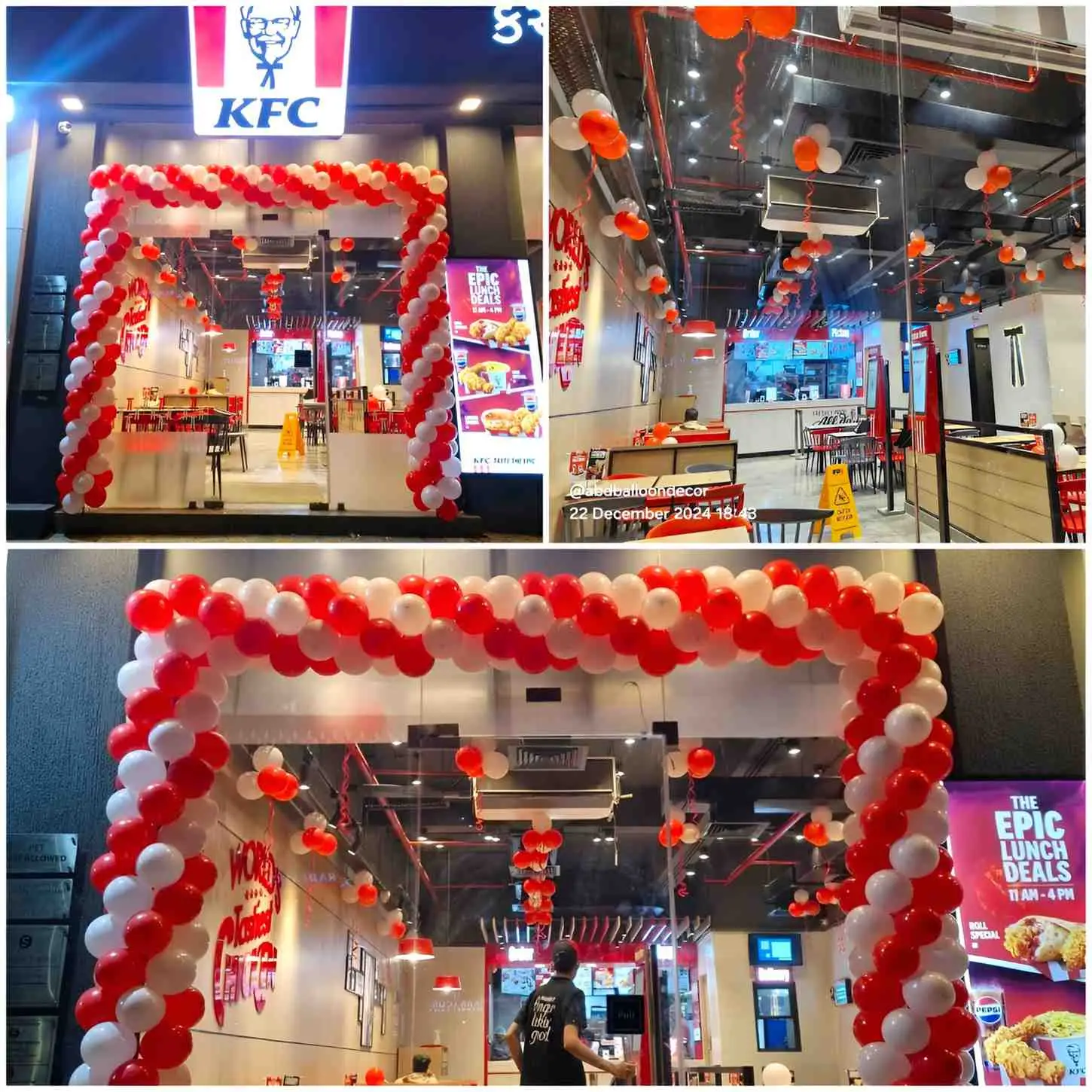 Our expert decorators design stunning balloon arches for restaurant entrances, table decorations, ceiling balloon styling, branding backdrops, and photo-worthy décor using high-quality red and white balloons that symbolize celebration, success, and hospitality. Whether you are opening a café, fast-food outlet, fine-dining restaurant, or food court outlet, we customize every decoration to match your theme and brand identity.