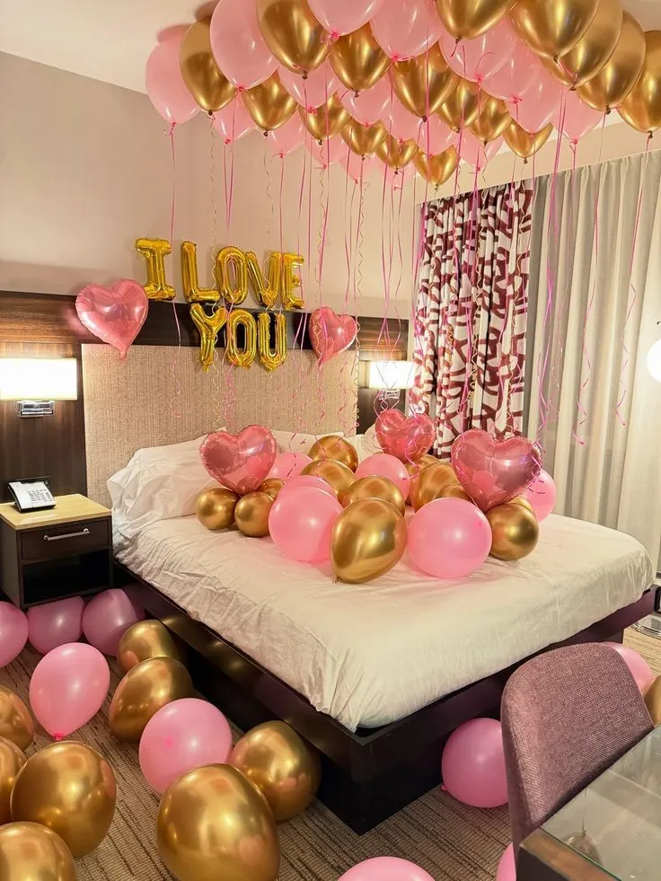 Celebrate love in style with our Valentine Decoration Setup. This romantic arrangement features golden and pink balloons, beautifully combined to create a dreamy ambiance. To make the celebration extra special, 50 “I Love You” golden foil balloons are elegantly placed on the floor, adding a luxurious and photogenic touch.